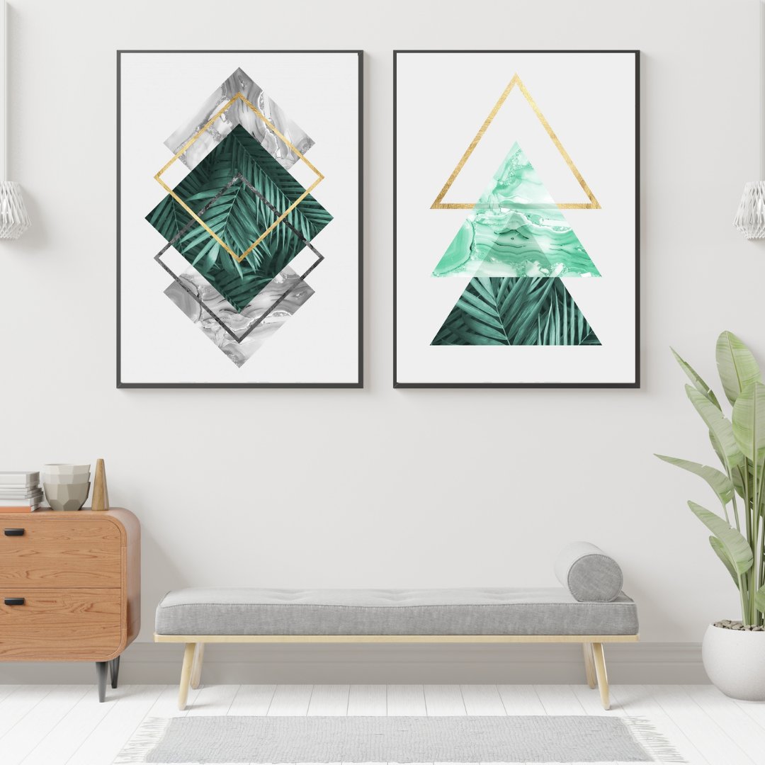 Jogo com 2 Quadros Decorativos Abstratos Geométricos em tons de Verde