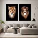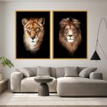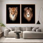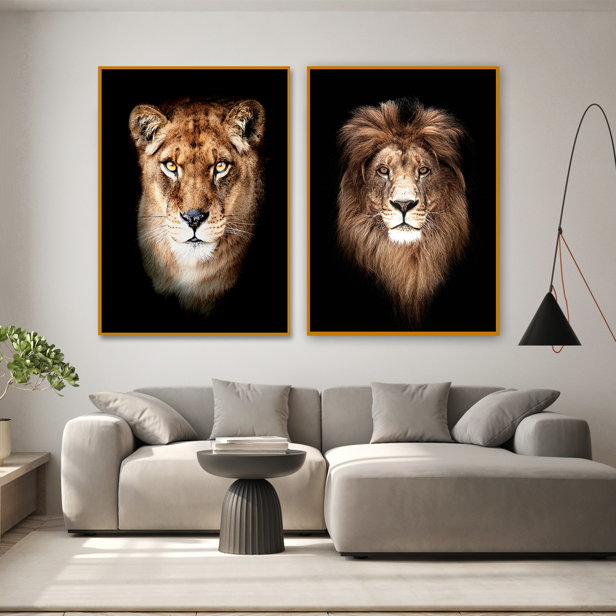 Nosso quadro de parede premium, apresentando uma imagem cativante de um leão e uma leoa, sobre um fundo preto dramático. Com qualidade de primeira linha, cada detalhe da majestade desses felinos magníficos é meticulosamente capturado, desde a textura imponente de suas crinas até o brilho intenso de seus olhos. A contrastente escuridão do fundo realça ainda mais a presença imponente dos leões, criando um impacto visual impressionante.
