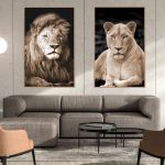 Nosso quadro de parede exclusivo, destacando uma imagem principal deslumbrante de uma dupla de leão e leoa. Com qualidade de primeira linha, cada penugem e matiz das araras é reproduzida com uma precisão excepcional, capturando a energia e a exuberância da natureza.