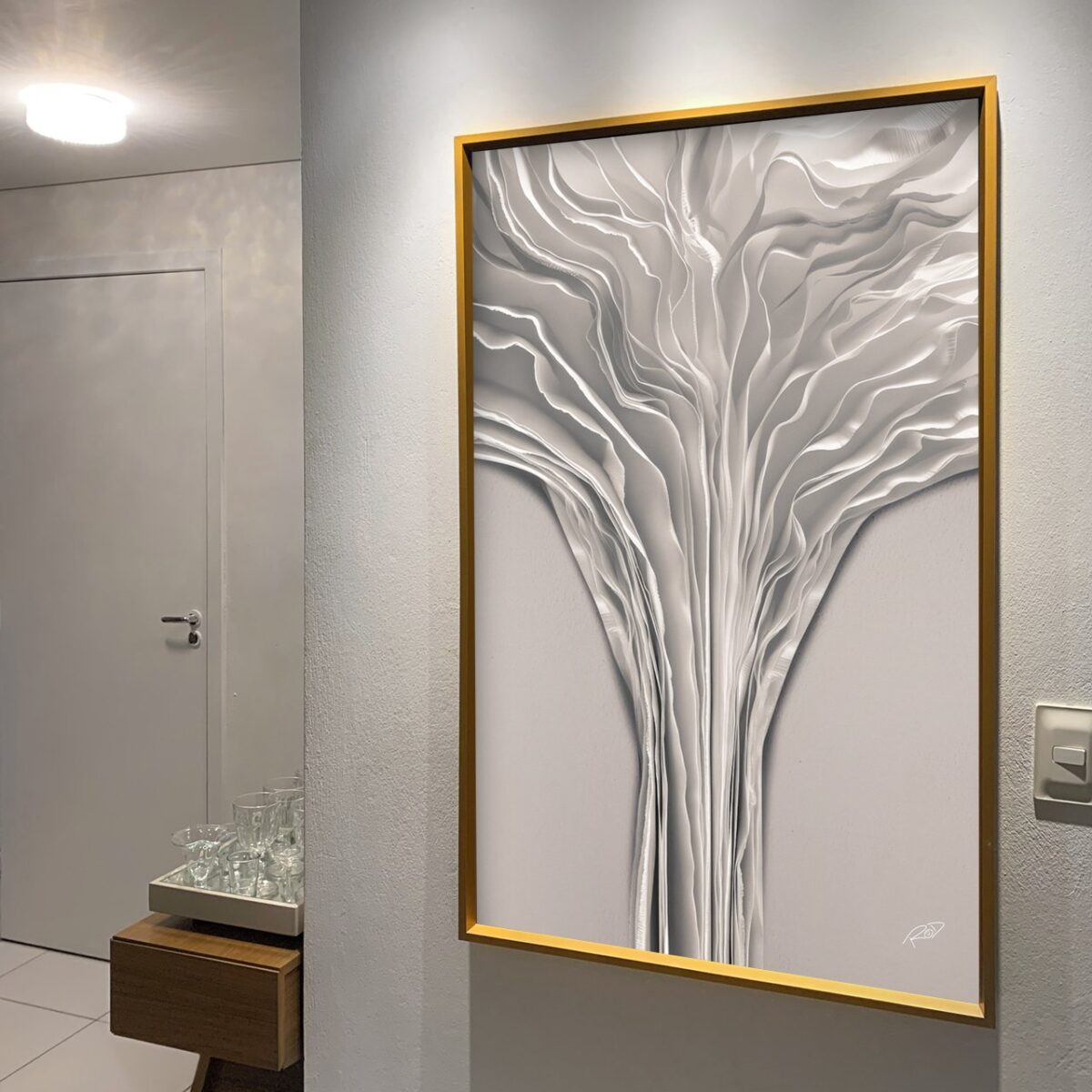 Material leve, resistente e de superfície lisa. A impressão é feita diretamente na placa, garantindo alta definição e fidelidade das cores com a adição de uma folha de vidro na frente. O resultado é um visual mais moderno e clean, com acabamento uniforme e sem relevo. Perfeito para ambientes com decoração contemporânea e minimalista.