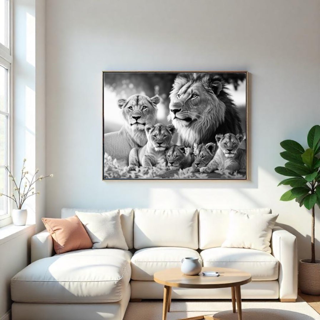 Esta bela arte Arte Família de Leões Preto e Branco é uma obra de arte de primeira linha. Impresso com detalhes realistas e cores vibrantes, esta pintura é perfeita para qualquer fã de arte natural ou de decoração de interiores elegante. Compre hoje e adicione um toque de beleza e mistério à sua casa.