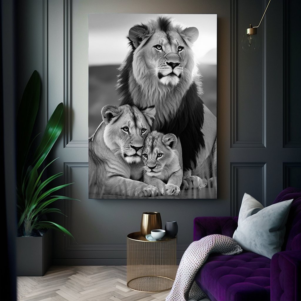 Esta bela arte Família de Leões Preto e Branco é uma obra de arte de primeira linha. Impresso com detalhes realistas e cores vibrantes, esta pintura é perfeita para qualquer fã de arte natural ou de decoração de interiores elegante. Compre hoje e adicione um toque de beleza e mistério à sua casa.