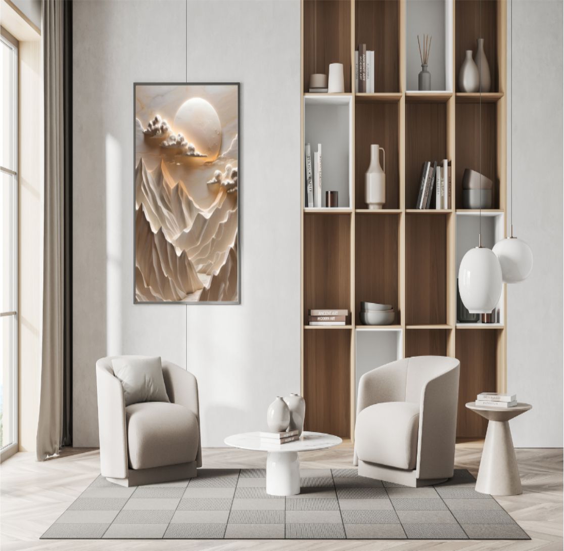 Esta bela arte Arte Figurativa Montanhas, Nuvens e Lua com Efeito 3D em Tons Neutros é uma obra de arte de primeira linha. Impresso com detalhes realistas e cores vibrantes, esta pintura é perfeita para qualquer fã de arte natural ou de decoração de interiores elegante. Compre hoje e adicione um toque de beleza e mistério à sua casa.