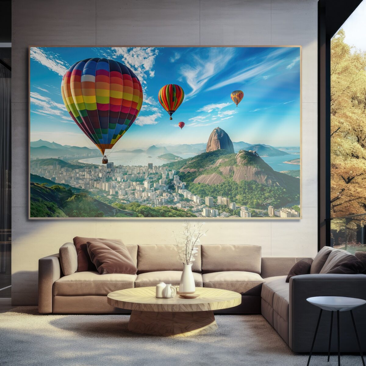 Esta bela arte Balões Sobrevoando a Cidade do Rio de Janeiro é uma obra de arte de primeira linha. Impresso com detalhes realistas e cores vibrantes, esta pintura é perfeita para qualquer fã de arte natural ou de decoração de interiores elegante. Compre hoje e adicione um toque de beleza e mistério à sua casa.
