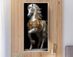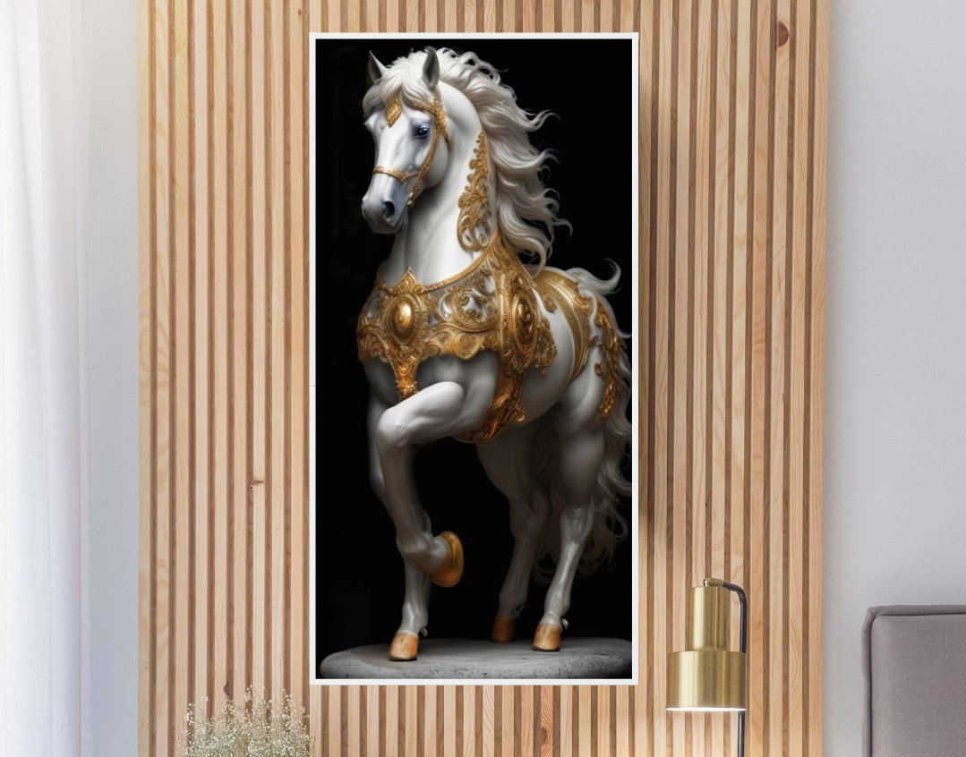 Esta bela arte Cavalo Branco com Armadura Dourada é uma obra de arte de primeira linha. Impresso com detalhes realistas e cores vibrantes, esta pintura é perfeita para qualquer fã de arte natural ou de decoração de interiores elegante. Compre hoje e adicione um toque de beleza e mistério à sua casa.