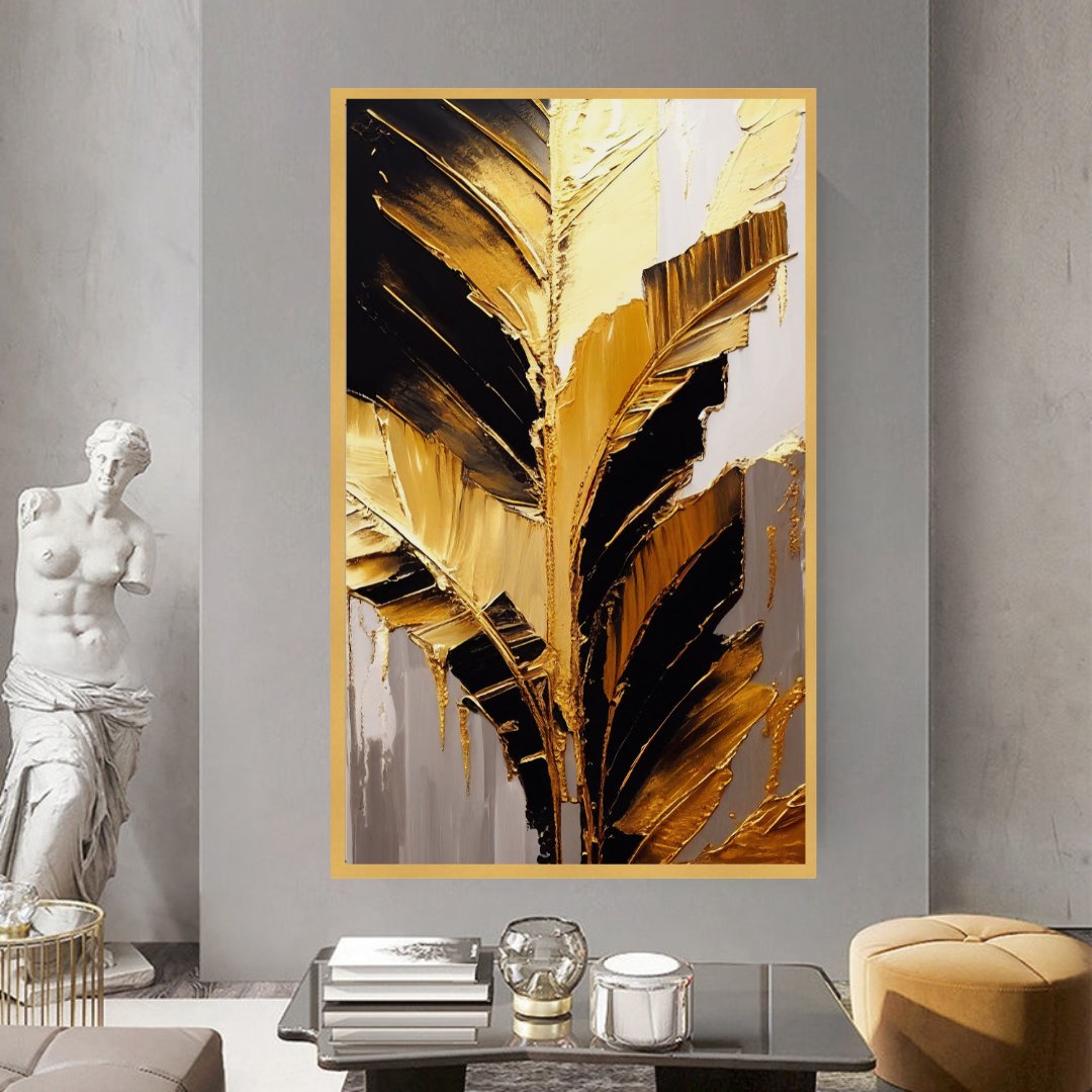 Esta bela arte Abstrato Folhas com Detalhes Dourados é uma obra de arte de primeira linha. Impresso com detalhes realistas e cores vibrantes, esta pintura é perfeita para qualquer fã de arte natural ou de decoração de interiores elegante. Compre hoje e adicione um toque de beleza e mistério à sua casa.