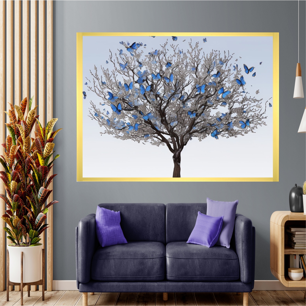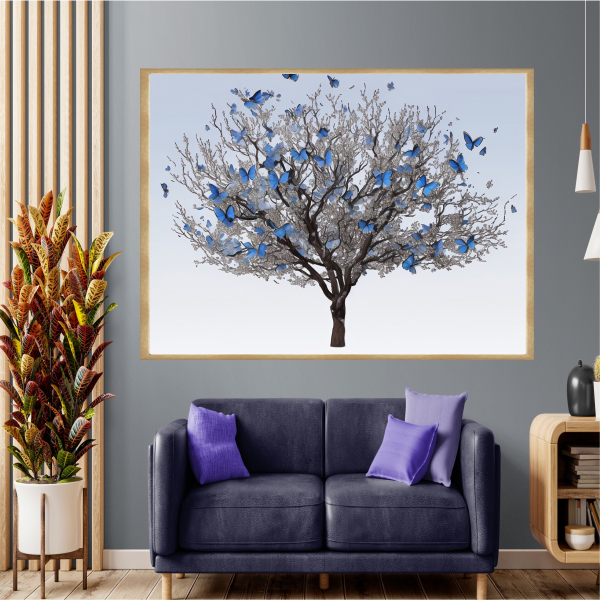 Esta bela pintura de uma árvore com borboletas azuis é uma obra de arte de primeira linha. Impresso com detalhes realistas e cores vibrantes, esta pintura é perfeita para qualquer fã de arte natural ou de decoração de interiores elegante. Compre hoje e adicione um toque de beleza e mistério à sua casa.