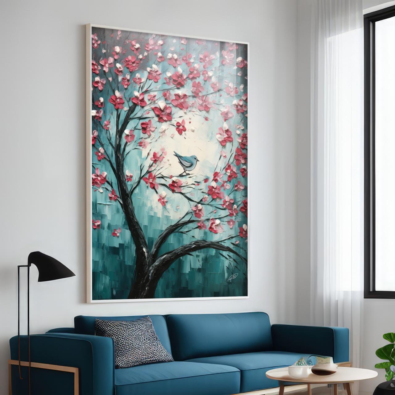 Esta bela arte Árvore com Flores e Pássaro é uma obra de arte de primeira linha. Impresso com detalhes realistas e cores vibrantes, esta pintura é perfeita para qualquer fã de arte natural ou de decoração de interiores elegante. Compre hoje e adicione um toque de beleza e mistério à sua casa.