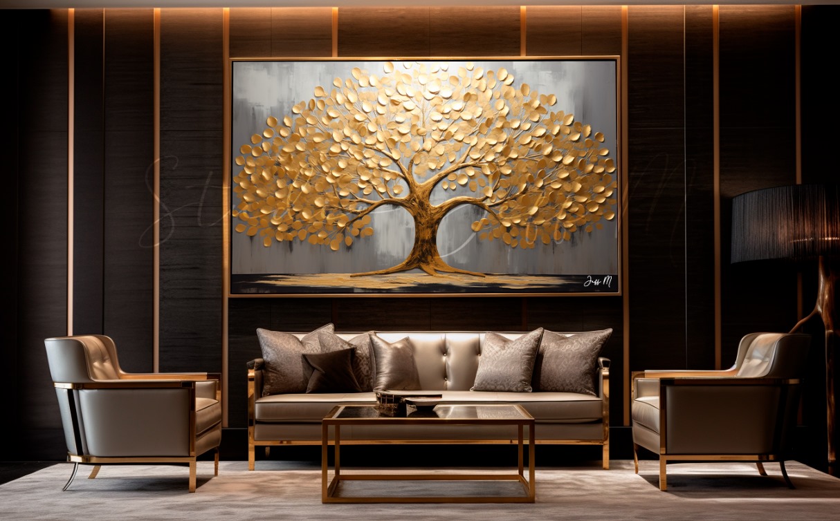 Esta bela arte Árvore da Vida Gold é uma obra de arte de primeira linha. Impresso com detalhes realistas e cores vibrantes, esta pintura é perfeita para qualquer fã de arte natural ou de decoração de interiores elegante. Compre hoje e adicione um toque de beleza e mistério à sua casa.