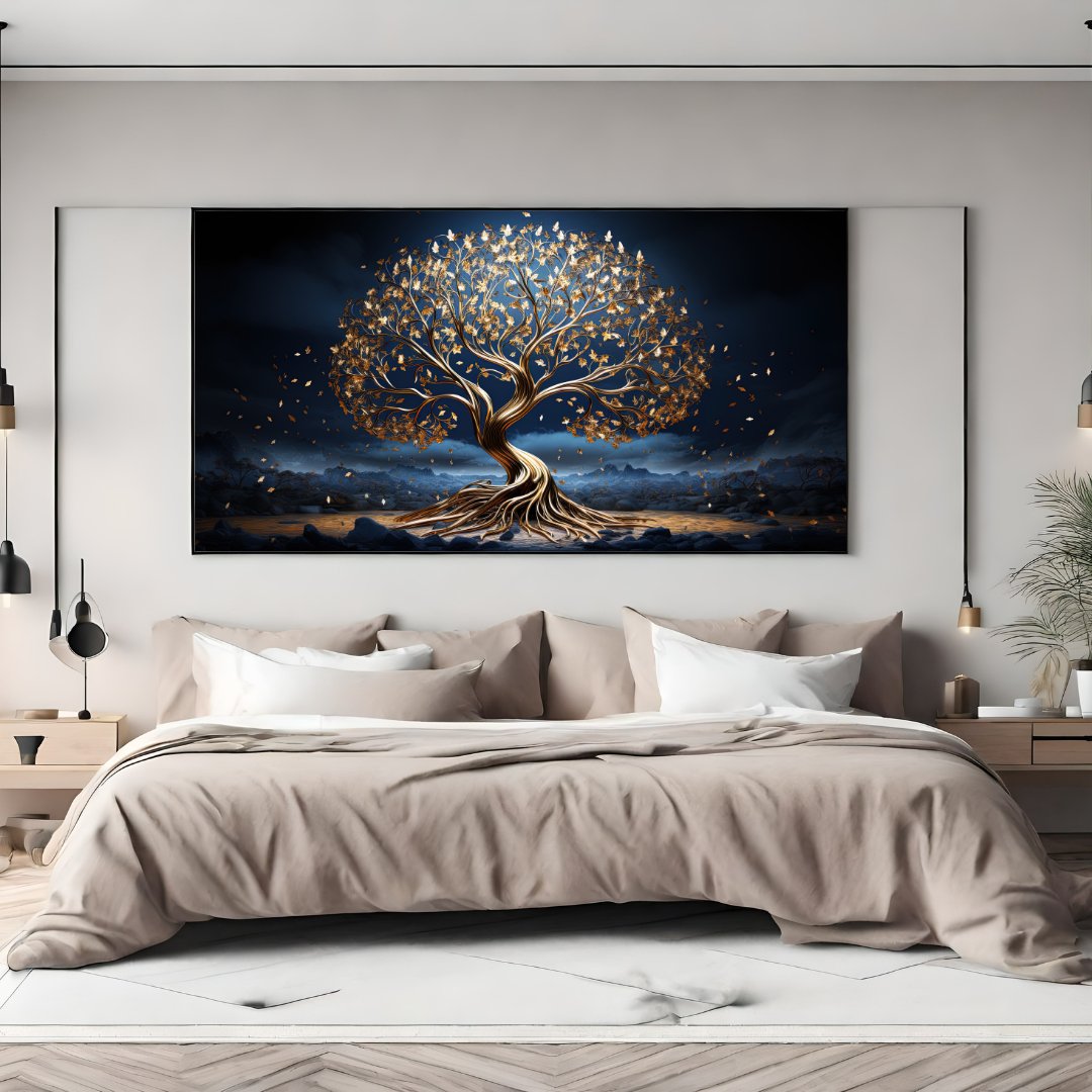 Esta bela arte Árvore Dourada no Fundo Azul é uma obra de arte de primeira linha. Impresso com detalhes realistas e cores vibrantes, esta pintura é perfeita para qualquer fã de arte natural ou de decoração de interiores elegante. Compre hoje e adicione um toque de beleza e mistério à sua casa.