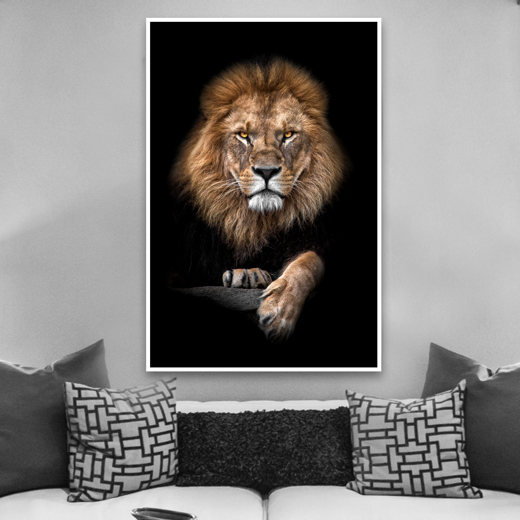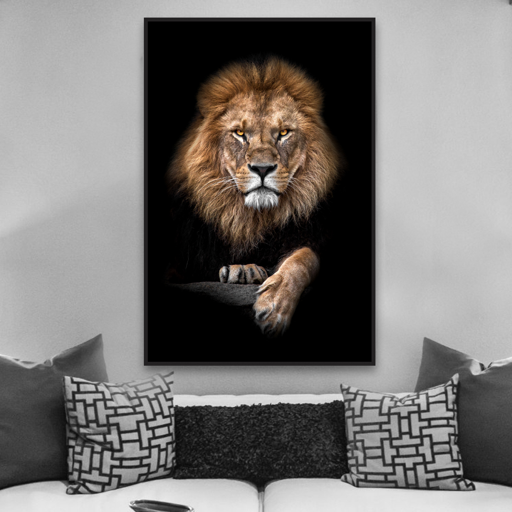 Este quadro de um leão ao fundo preto é uma obra de arte de primeira linha. Ele é pintado com detalhes realistas e cores vibrantes. O quadro é perfeito para qualquer fã de animais selvagens ou de decoração de interiores elegante. Compre hoje e adicione um toque de beleza e poder à sua casa.