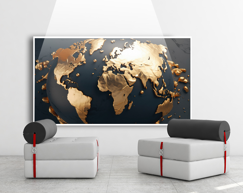 Nossa excepcional arte de parede com um impressionante mapa do mundo em preto e dourado. Feito com qualidade de primeira linha, cada detalhe é meticulosamente capturado, destacando a elegância e sofisticação do esquema de cores preto e dourado.