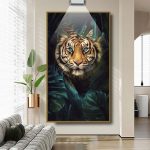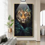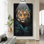 Nosso quadro de parede excepcional, destacando a imagem principal de um tigre em toda a sua grandiosidade. Com qualidade de primeira linha, cada detalhe é meticulosamente capturado, desde as poderosas listras até os olhos penetrantes do tigre. Esta obra-prima vai além da mera representação, transportando você para a essência da natureza selvagem e imponente.