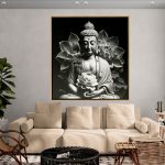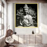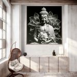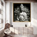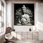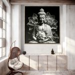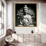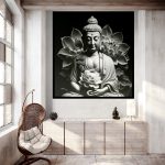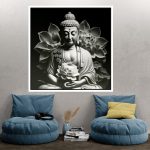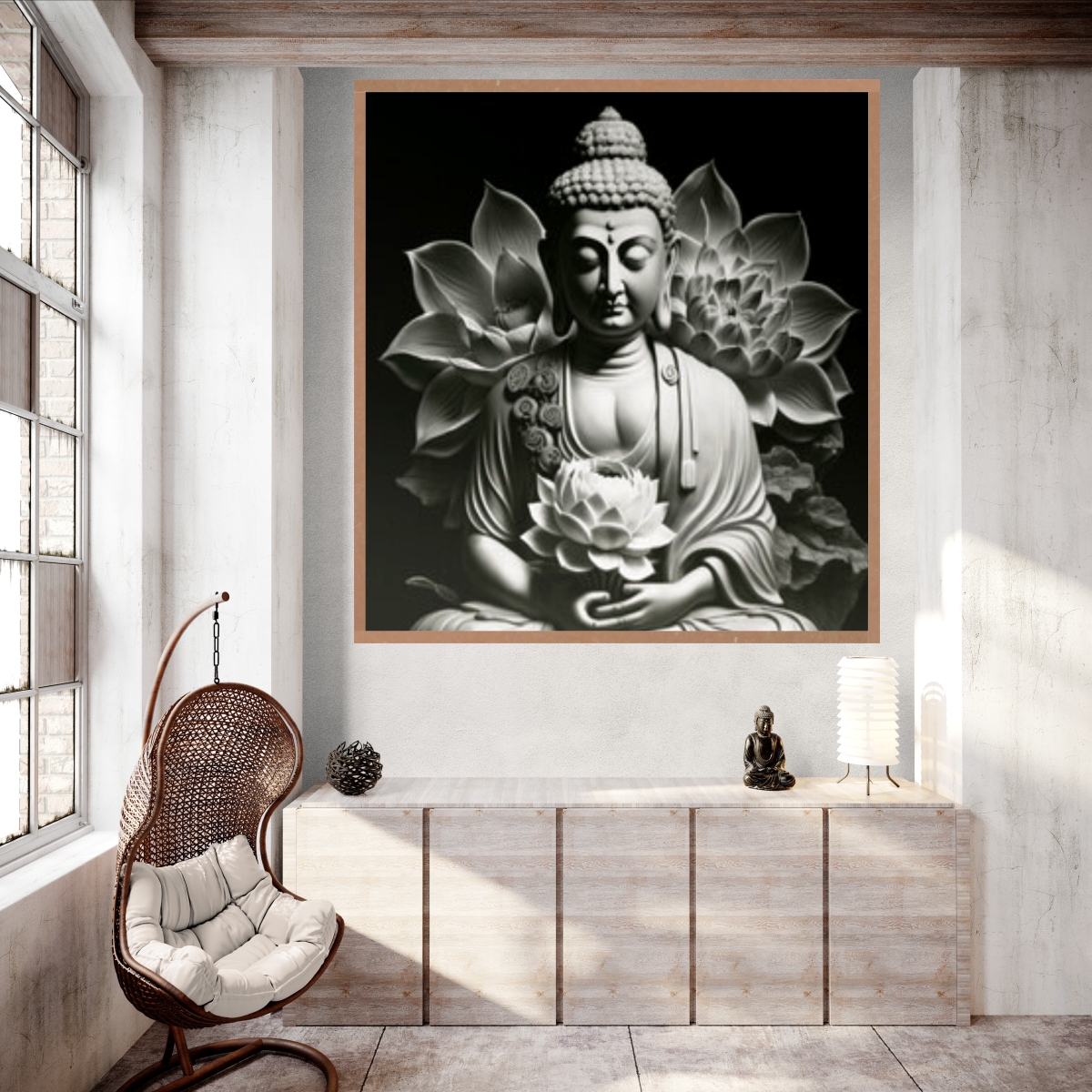 Este quadro de um Buda figurativo preto e branco é uma obra de arte de primeira linha. Ele é impresso com detalhes realistas e cores ricas. O quadro é perfeito para qualquer fã do budismo ou de decoração de interiores elegante. Compre hoje e adicione um toque de serenidade e paz à sua casa.