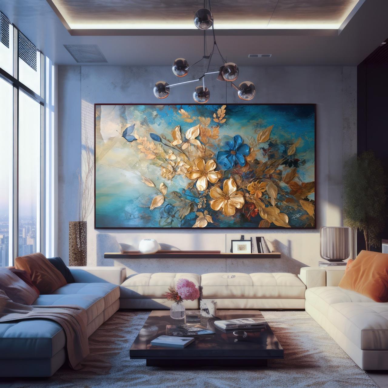 Esta bela arte Floral com Tons de Azul e Dourado é uma obra de arte de primeira linha. Impresso com detalhes realistas e cores vibrantes, esta pintura é perfeita para qualquer fã de arte natural ou de decoração de interiores elegante. Compre hoje e adicione um toque de beleza e mistério à sua casa.