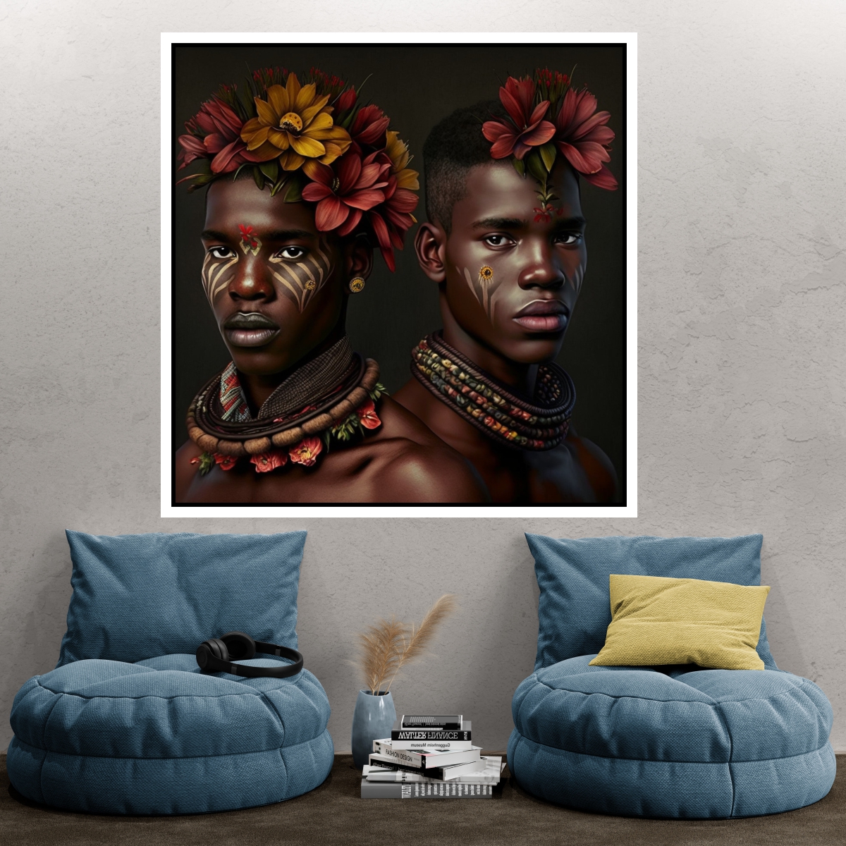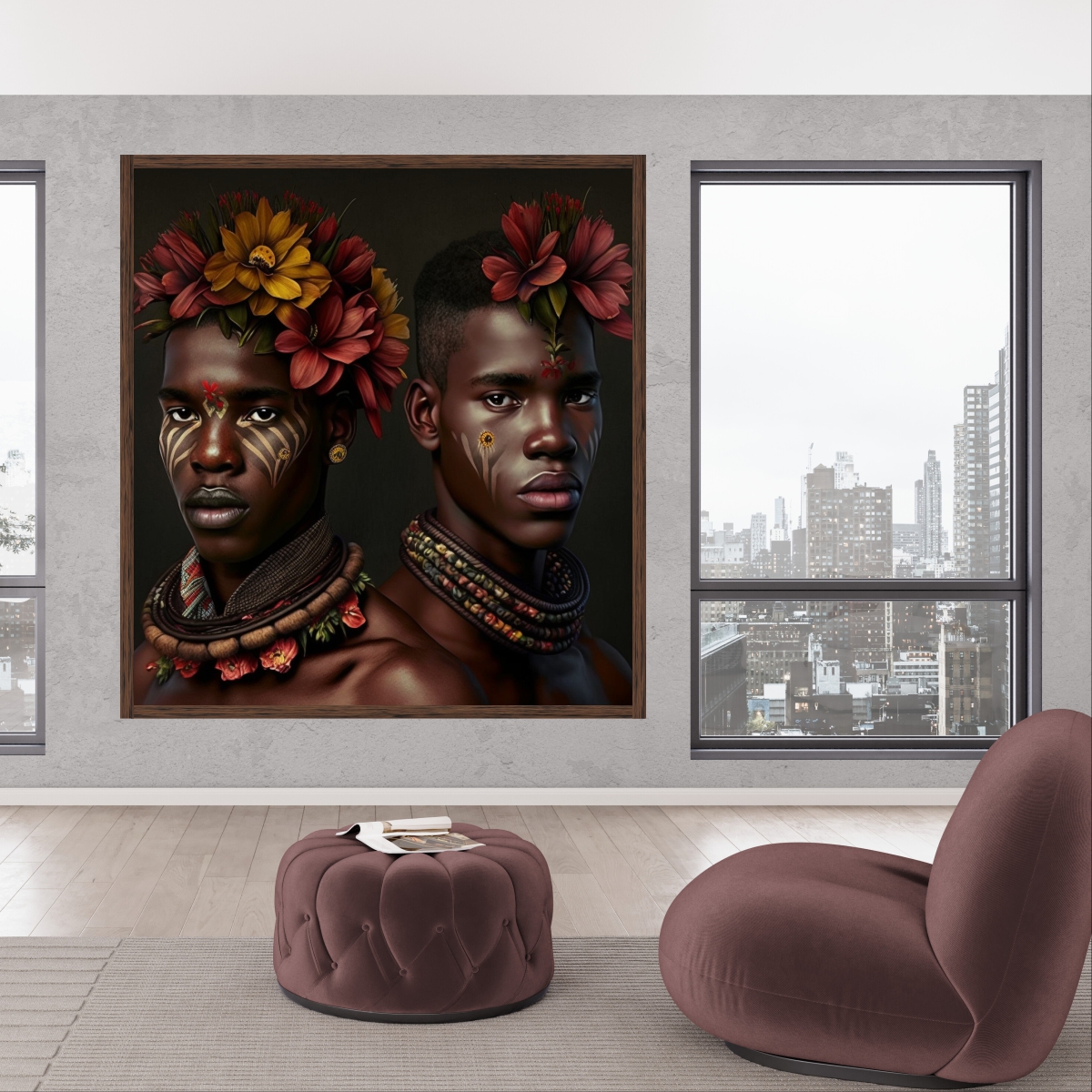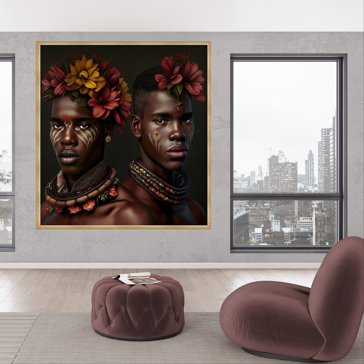 Este quadro de homens negros figurativos com florais é uma obra de arte de primeira linha. Ele é impresso com detalhes realistas e cores vibrantes. O quadro é perfeito para qualquer fã de arte afro-americana ou de decoração de interiores elegante. Compre hoje e adicione um toque de beleza e mistério à sua casa.