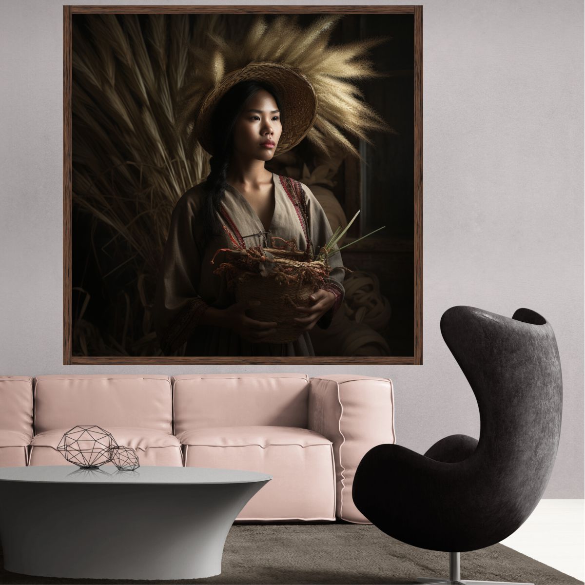 Esta bela arte Mulher Asiática ao Fundo Trigos Secos é uma obra de arte de primeira linha. Impresso com detalhes realistas e cores vibrantes, esta pintura é perfeita para qualquer fã de arte natural ou de decoração de interiores elegante. Compre hoje e adicione um toque de beleza e mistério à sua casa.