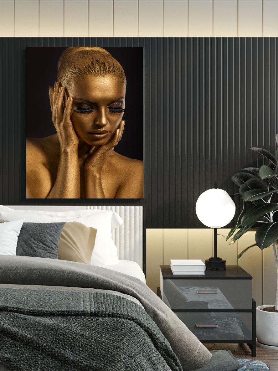 Esta bela arte Mulher Com Efeito Metalizado é uma obra de arte de primeira linha. Impresso com detalhes realistas e cores vibrantes, esta pintura é perfeita para qualquer fã de arte natural ou de decoração de interiores elegante. Compre hoje e adicione um toque de beleza e mistério à sua casa.