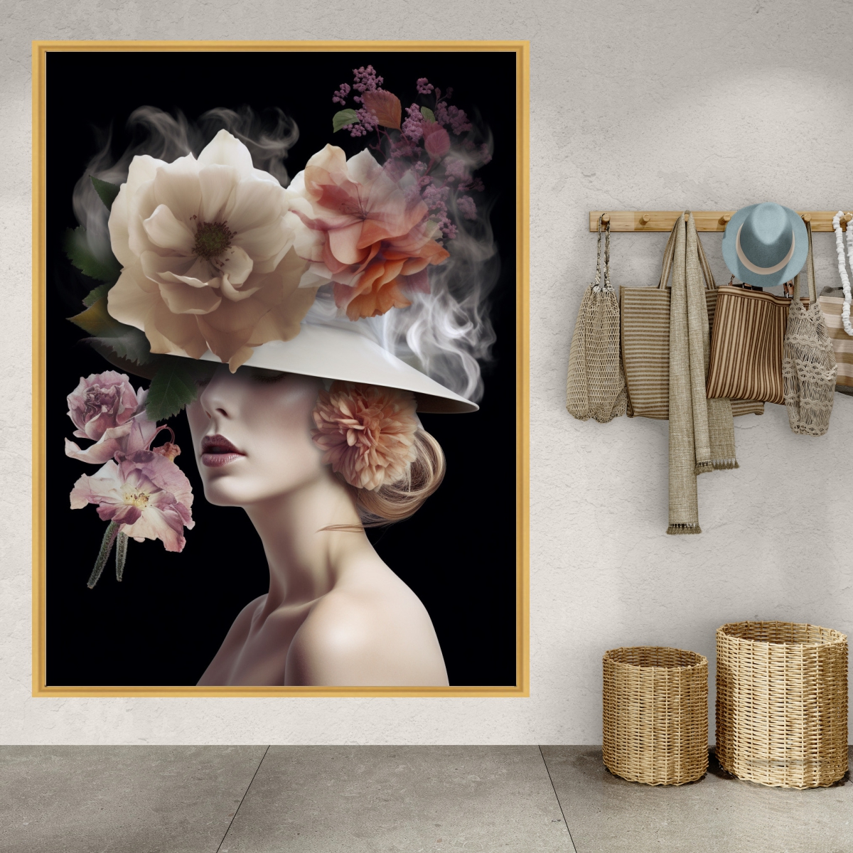 Esta bela arte Mulher Figurativa Chapéu Floral é uma obra de arte de primeira linha. Impresso com detalhes realistas e cores vibrantes, esta pintura é perfeita para qualquer fã de arte natural ou de decoração de interiores elegante. Compre hoje e adicione um toque de beleza e mistério à sua casa.
