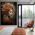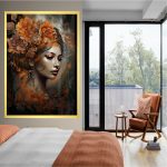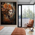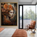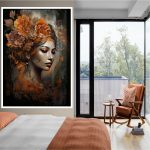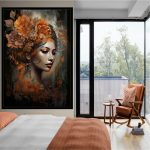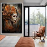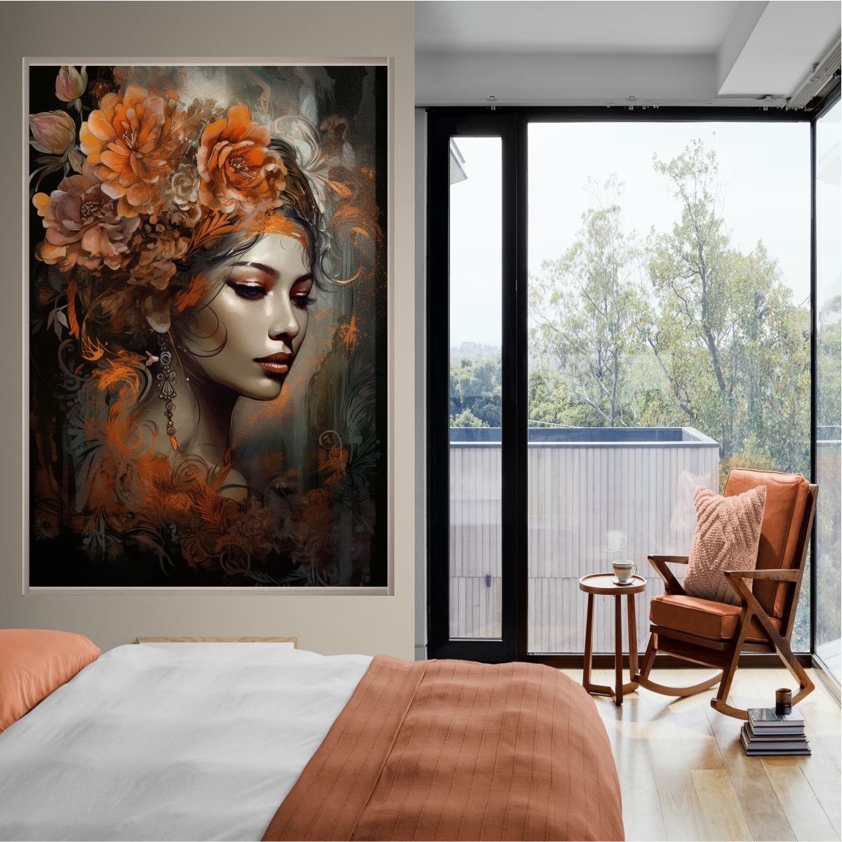 Esta bela arte Mulher Figurativa com Florais Alaranjados é uma obra de arte de primeira linha. Impresso com detalhes realistas e cores vibrantes, esta pintura é perfeita para qualquer fã de arte natural ou de decoração de interiores elegante. Compre hoje e adicione um toque de beleza e mistério à sua casa.