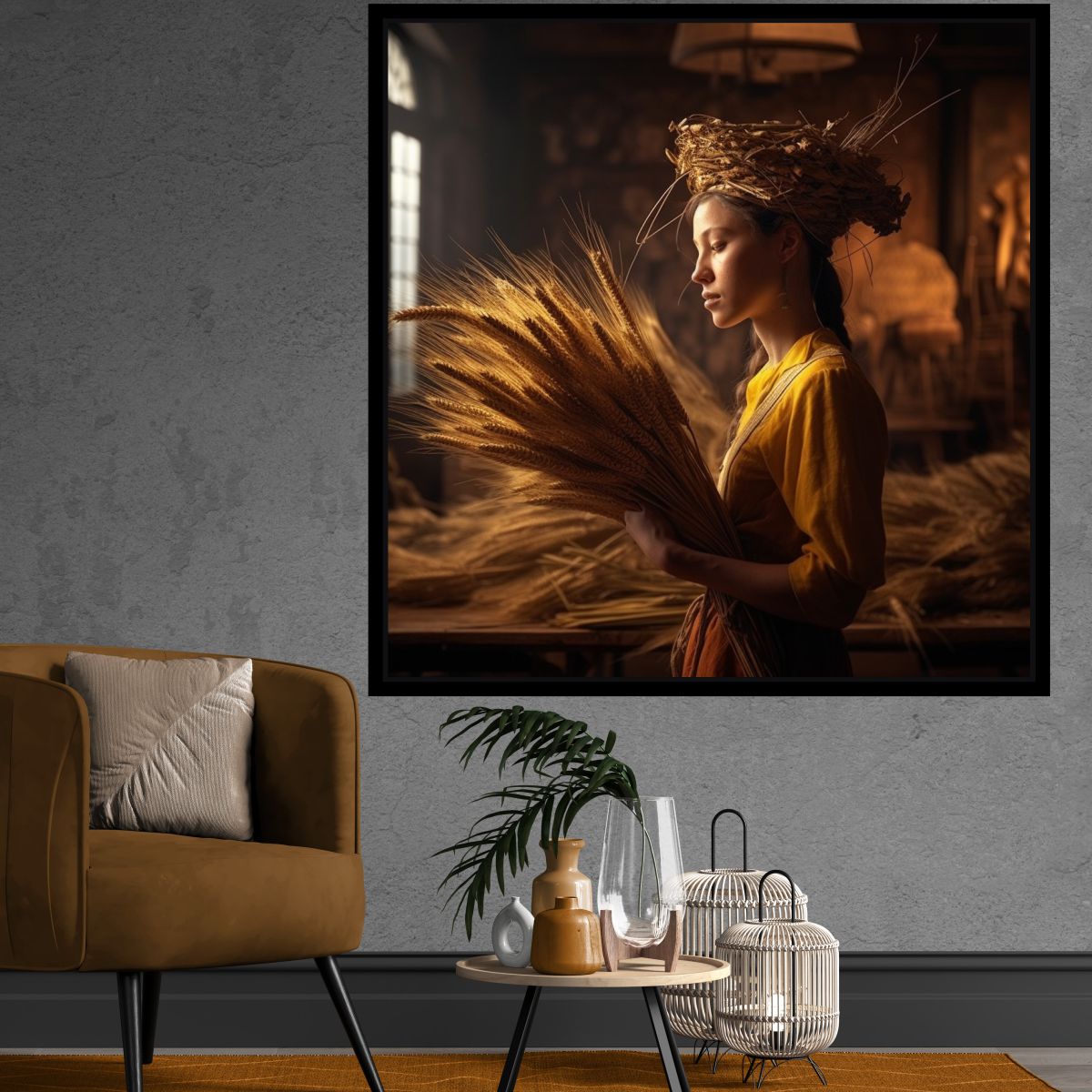 Esta bela arte Mulher Figurativa com Trigos Secos é uma obra de arte de primeira linha. Impresso com detalhes realistas e cores vibrantes, esta pintura é perfeita para qualquer fã de arte natural ou de decoração de interiores elegante. Compre hoje e adicione um toque de beleza e mistério à sua casa.