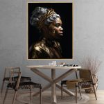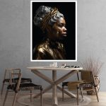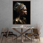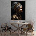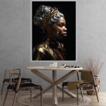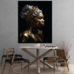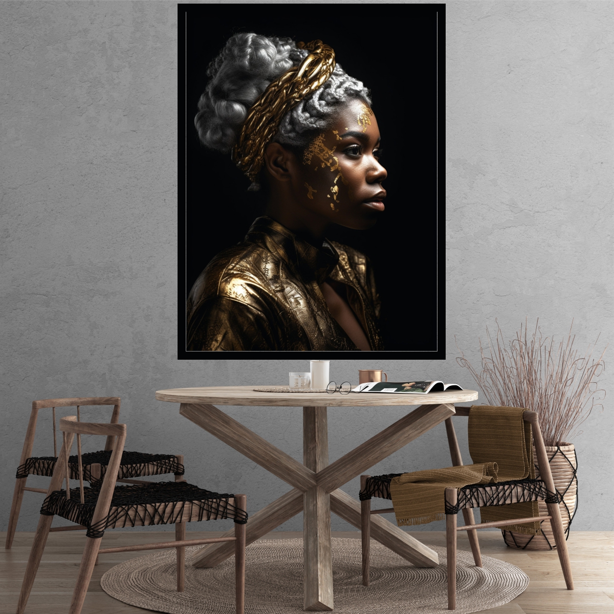 Esta bela arte Mulher Negra com Detalhes em Dourado é uma obra de arte de primeira linha. Impresso com detalhes realistas e cores vibrantes, esta pintura é perfeita para qualquer fã de arte natural ou de decoração de interiores elegante. Compre hoje e adicione um toque de beleza e mistério à sua casa.